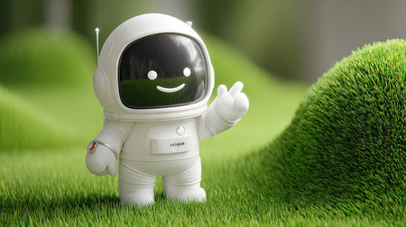A charming cartoon astronaut figure stands in a vibrant green field, reaching a hand out. The scene is brightly lit, likely outdoors on a sunny day. The figure's white suit contrasts with the grass. This image is suitable for various commercial uses, including advertising and educational content.