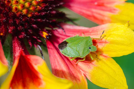 Green bug crawling on a yellow-red flower. Palomena prasina on Gaillardia.