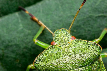 shield bug. head. insect portrait. colorful detailed macro photo of an insect. close-up. text space. compound eyes. screensaver. bug. chinch .Acanthosomatidae. Palomena prasina. beetle