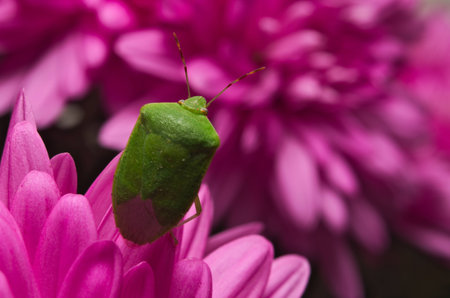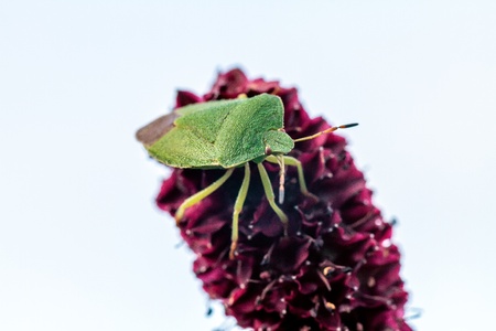 Green shield bug (Palomena prasina) on purple flowers