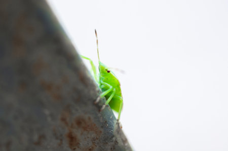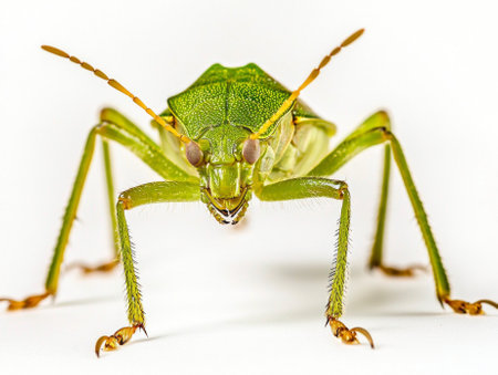 striking green stink bug teeters on its legs, its bright green body and sharp features capturing attention in stark contrast to the white background, highlighting its unique insect form.