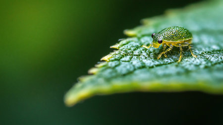 a green forest bug sits on a green leaf, close-up in a natural environment