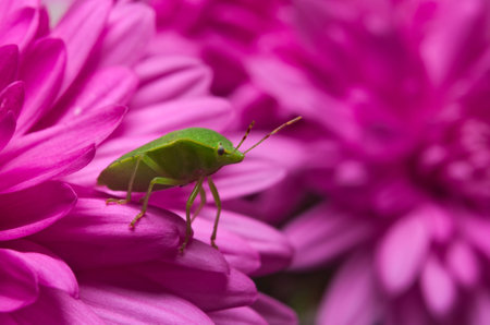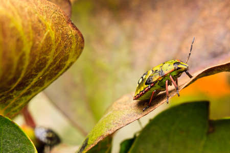 Natural closeup of a colorful green nymph of the Southern Green Stink Bug, Nezara virudula in the garden