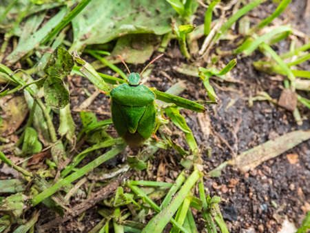 Macro shot of Common Green Shieldbug (Palomena prasina) on ground between vegetation. Adults are bright green in the spring and summer, but finely punctured with dark marks