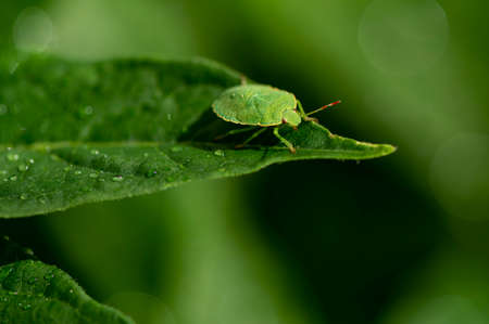 Macro shot of a green shield bug (Palomena prasina) sitting on a leaf with water drops.