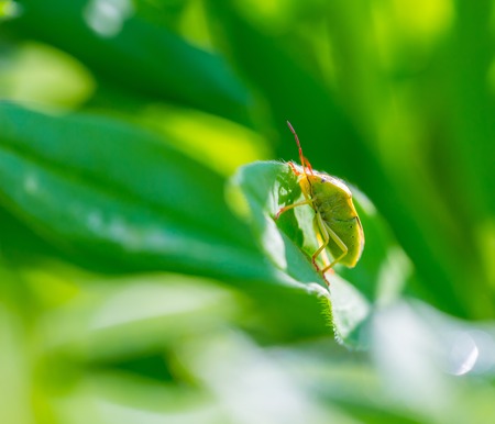 The bug the green tree shield Palomena prasina sits on the leaf.