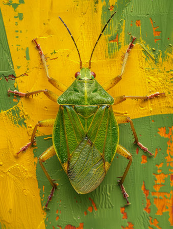 Brightly Colored Green Shield Bug on Abstract Yellow and Green Background Nature's Art in Vibrant Close up AI Generative