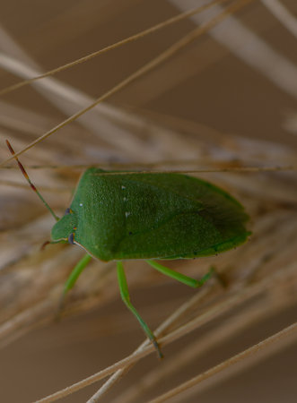 Macro photo of a green stink bug crawling along a rye stalk in Cyprus. Mediterranean field scene with warm natural tones and fine detail.