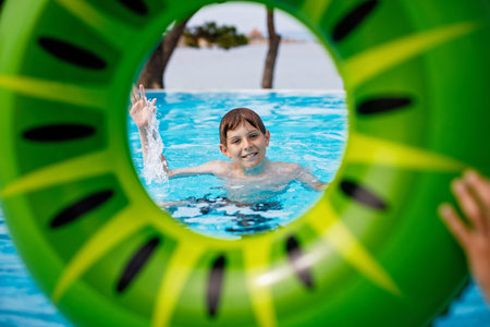 Cool school boy having fun on inflatable rubber circle in outdoor pool. Summer holiday. Summertime kids weekend. Child in swiming pool. Funny kid boy on ring at aquapark on family vacation.