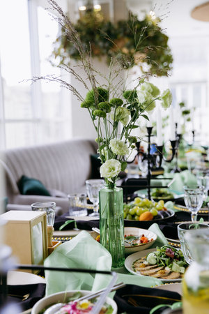 A beautifully arranged dining table ready for a festive gathering, featuring a delicious pot of food, fresh bread, and elegant candles. The warm ambiance is enhanced by green decorations, creating a welcoming atmosphere for family and friends