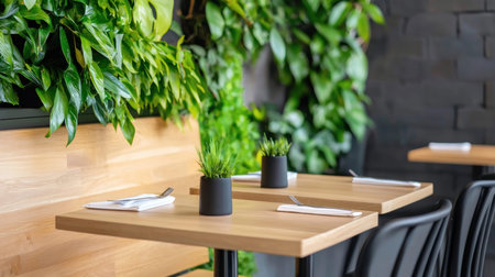 Wooden tables with plants and chairs in a modern restaurant interior.