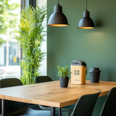 Discover a modern workspace featuring a wooden table, vibrant plants, and soothing green walls. Perfect for productivity and creativity in a serene environment.