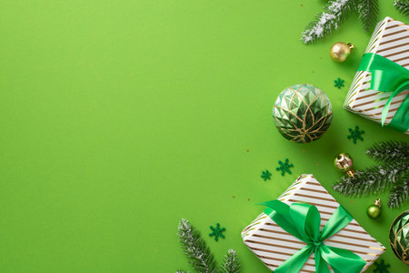 Christmas Eve concept. Top view photo of gift boxes with ribbon bows gold and green baubles confetti and fir branches on isolated green background with copyspace