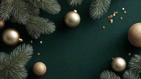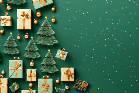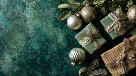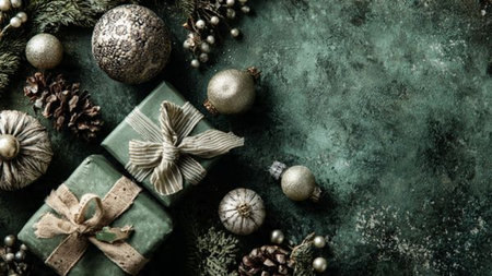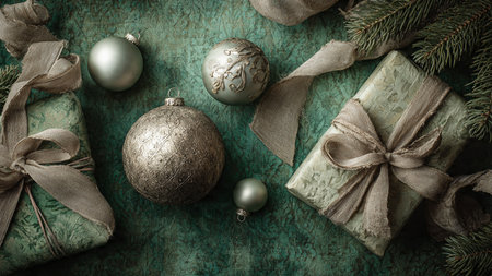beautifully arranged flat lay features green gift boxes adorned with decorations surrounded by pine branches and Christmas ornaments perfect for festive occasions.