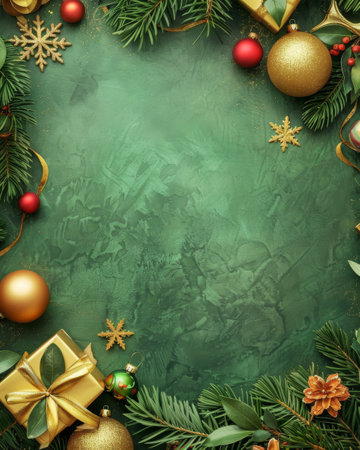 A vibrant Christmas background featuring green ornaments, gifts, pine cones, and stars, designed to provide ample space for adding personalized holiday messages or greetings.
