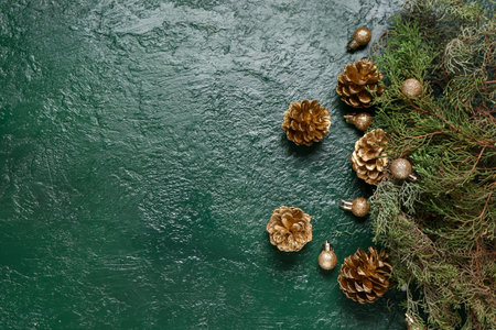 Festive christmas pine cone ornaments and evergreen branches on green background