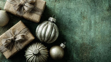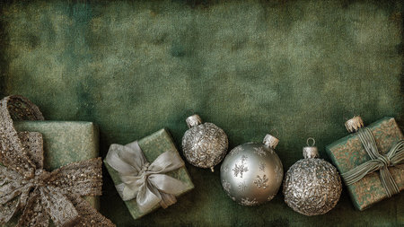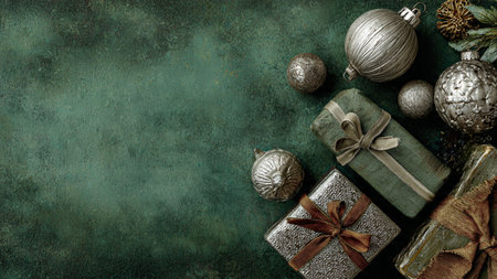A smooth matte green surface bordered by premium wrapped presents and metallic silver ornaments.
