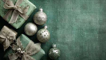 Elegant flat lay featuring warm green shadows, silver baubles, and modern holiday ribbons.