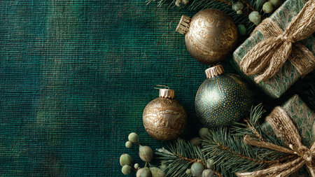Stylish emerald-and-gold composition with premium winter decorations arranged artistically.