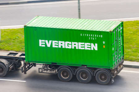 Truck with trailer and green container company Evergreen on city highway. Russia, Saint-Petersburg. 01 august 2020