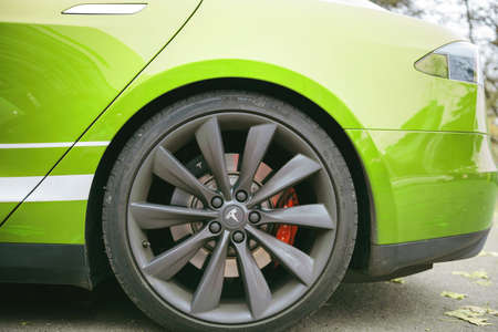 Close-up of aluminum rim of a new Tesla Motors car parked in city