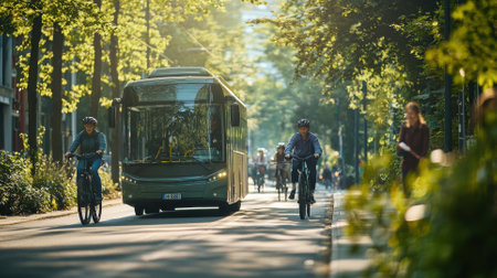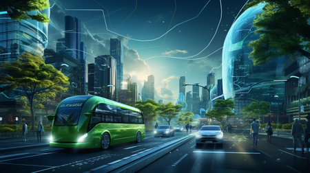 Autonomous eco-friendly shuttle bus self driving across city road. Smart futuristic vehicle concept. AI generated