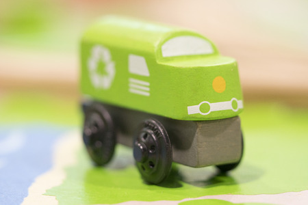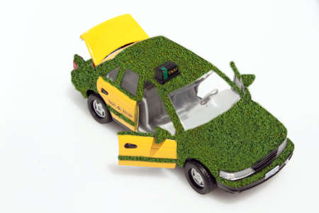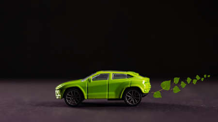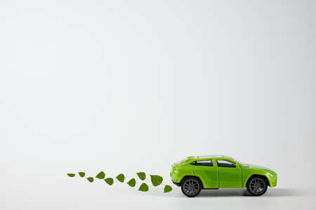 A toy green car rides over the background with an exhaust from birch leaves. The concept of reducing CO2 emissions from vehicles.