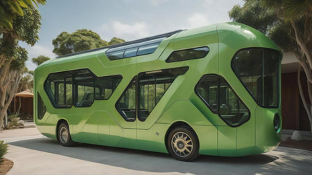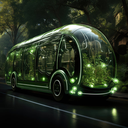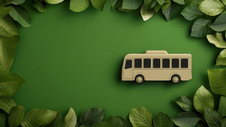 A striking image showcasing a bus on a green background surrounded by fresh leaves, symbolizing eco-friendly travel and sustainability in modern transportation.
