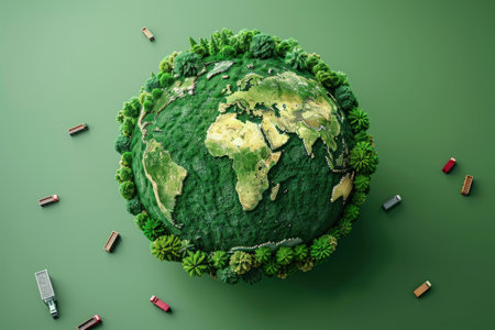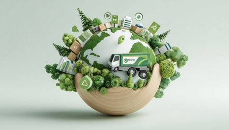 This image presents a conceptual illustration of an earth globe embraced by a wooden bowl and surrounded by green vegetation. A delivery truck is placed on the globe. The composition is bright with soft lighting, incorporating environmental elements. This image may be suitable for advertisements or editorial content concerning sustainability.