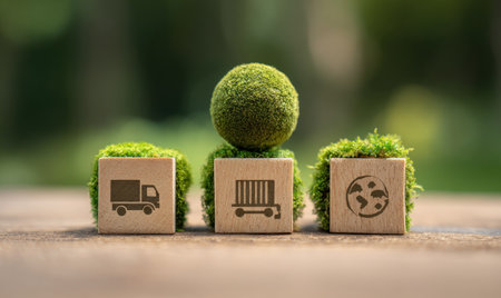 This image showcases a symbolic representation of eco-friendly logistics. It features wooden blocks adorned with transportation and environmental icons. The composition, set against a blurred background, uses natural colors and textures, possibly suggesting themes such as sustainability and global commerce. The image could be used for various commercial or editorial applications.