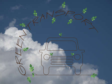 Green Transport twig text and car against a cloudy blue sky