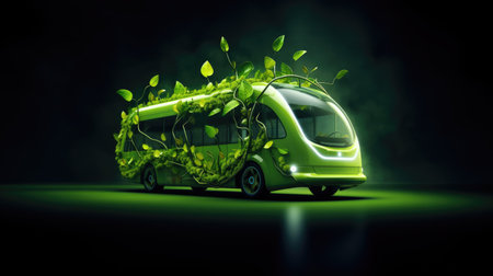 Modern electric bus with green leaves and plants. Bus ecology, eco transport, renewable and clean energy concept.
