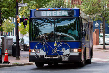 Annapolis, MD, USA 08/25/2020: A blue bus is making a left turn at the traffic lights in downtown Annapolis. The driver is wearing a face mask. It is mandatory to wear mask in public tranport