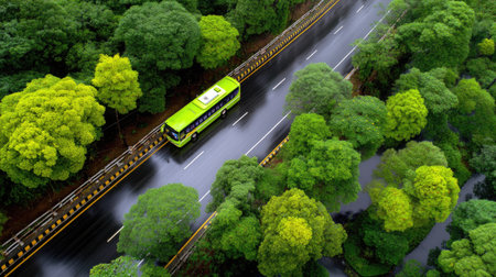 An aerial shot captures a bright green bus driving along a rainy road, framed by a dense canopy of vibrant green trees, highlighting city transportation amidst nature.