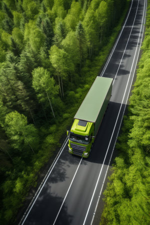 Aerial view of a green truck on the road in the forest