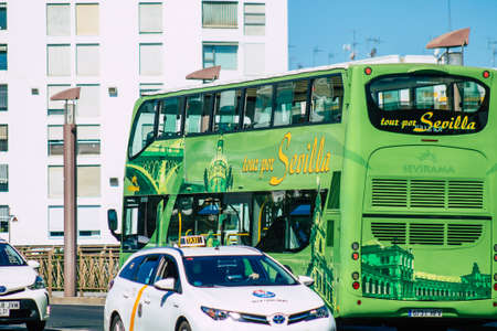 Seville Spain July 09, 2021 Tourist bus driving through the streets of Seville, an emblematic city and the capital of the region of Andalusia, in the south of Spain
