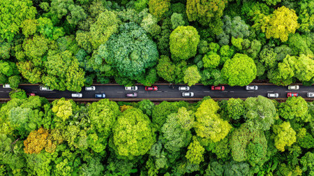 An overhead shot showcases a dense forest with a road cutting through. The trees display a variety of green hues and textures. A line of vehicles is seen traveling along the road. This image could be used for environmental, transportation, or landscape-related projects.