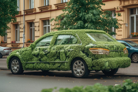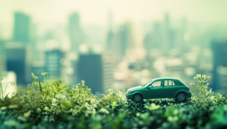 Urban cityscape featuring green car, representing eco friendly transport and sustainable living
