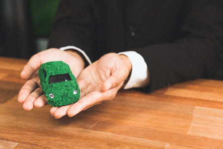 Businessman holding green eco car model in office. Electric vehicle utilized by eco-friendly business for environmental friendly transportation. Corporate responsible with zero CO2 emission. Alter