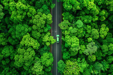 An AI generated illustration of a green car driving on a scenic country road, surrounded by lush green foliage