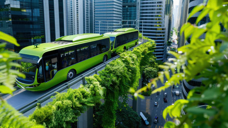 This stunning image captures two futuristic green buses traveling on an elevated track through a lush urban landscape, blending nature with modern architecture.