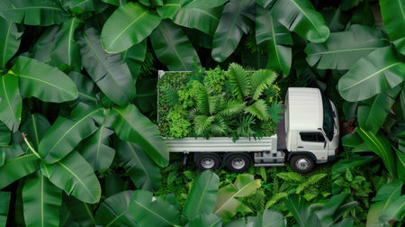 A delivery truck filled with lush green plants navigates through a dense tropical landscape, symbolizing eco-friendly transport and nature conservation.