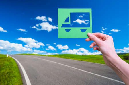 Hand holds green logistics symbol on the road