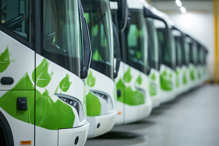 Eco friendly electric buses showcasing green logos, symbolizing commitment to sustainable and responsible public transport
