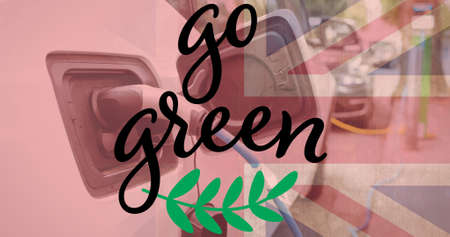 Digital composite of go green text over union jack and electric car at charging station. environmental conservation, transportation and identity.