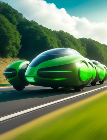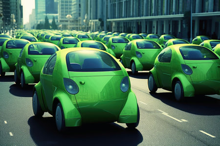 An AI generated illustration of the futuristic small green cars on the road