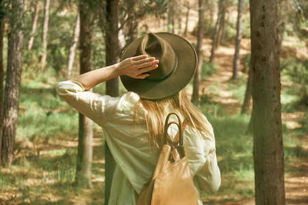 Hipster woman with backpack hold on smart phone gadget in forest. Traveler using mobile on background of mountains road. autumn lifestyle
