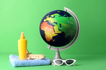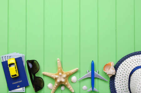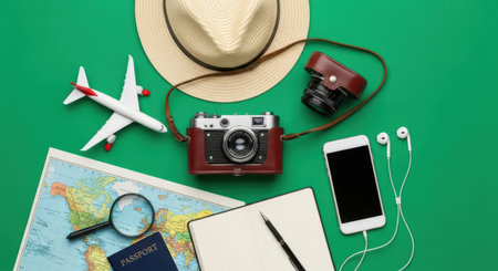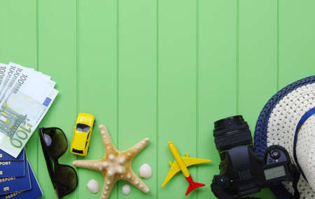 Traveler accessories on green wood background with blank space for text. Vacation concept. Flat lay, top view.
