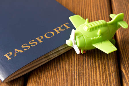 Passport and a small toy plane on a wooden table. The concept of travel . Close up