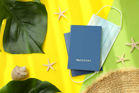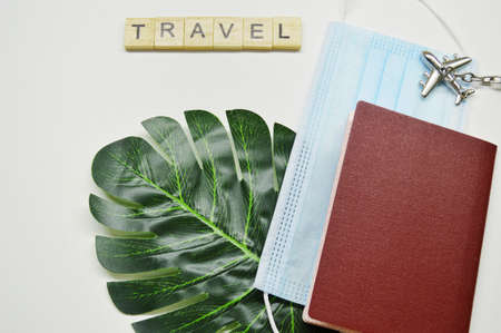 Passport with medical mask and keychain in the form of aircraft on a green palm leaf on white background. Travel word made from wooden cubes. Travel during quarantine